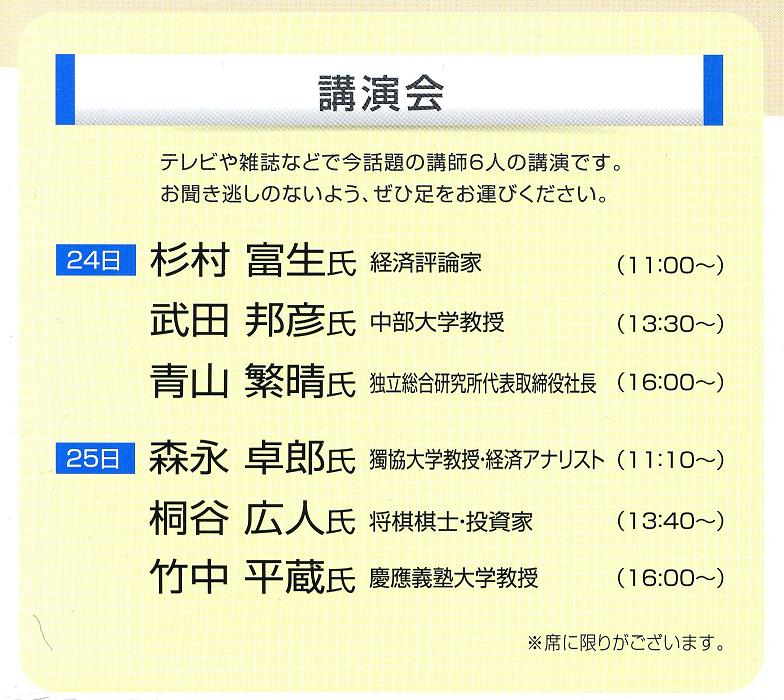 また、このイベントに参加していた人達が皆、株をやっている訳でも無さそうです。特に高齢者の方には会場の一角でやっていた「相続税対策」やら「生前贈与」といった講演がかなり人気のようでした。まぁ、もうすぐジュニアNISAも始まりますしね。