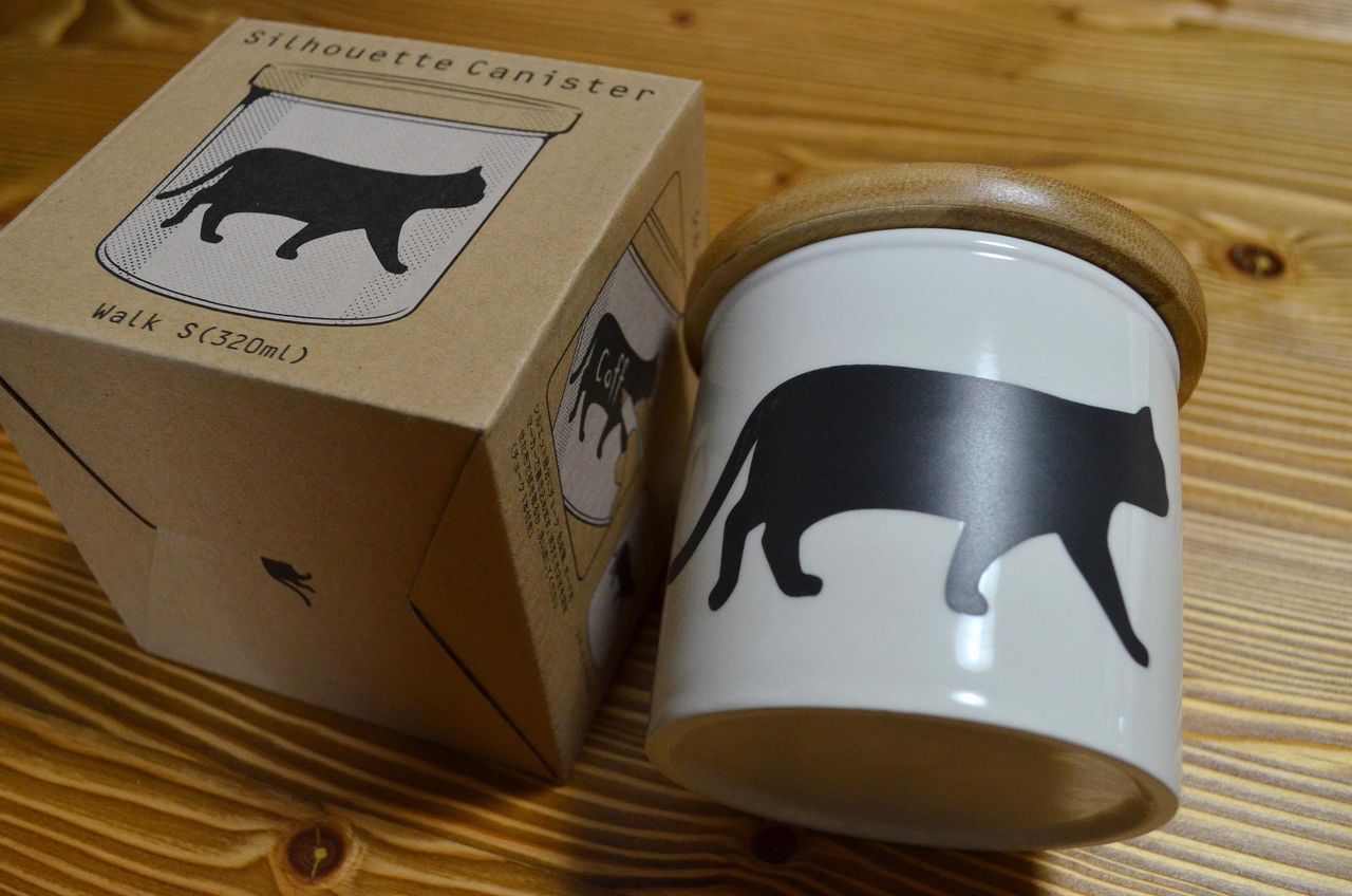 陶磁器製のストッカーです。丁度、珈琲豆をいれる容器を探していたので、渡りに船でした。内側にシリコンのパッキンが付いているので、珈琲豆などを入れるにはもってこいです。しかも先ほどのステッカーとお揃いの黒猫柄。