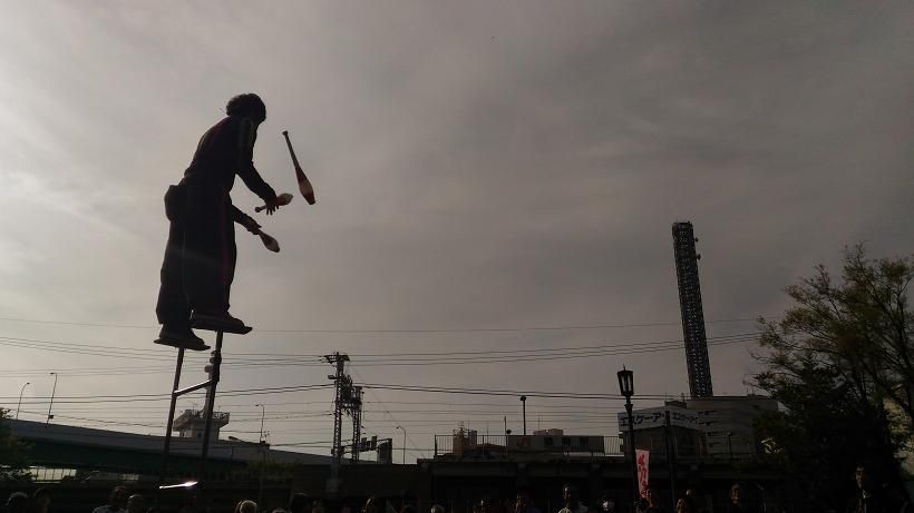 物珍しさに覗いてみると、想像以上にレベルの高いパフォーマンスに思わず見入ってしまいました。なんでもこの写真の方、ジャグリングの大会で優勝されているのだとか。いい感じにアルコールが入ったオジサンの野次にも笑顔で応えながら、脚立にのぼってジャグリングをこなす姿にはプロフェッショナルを感じます。