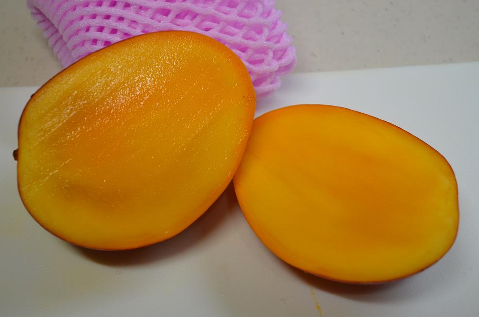 まぁ宮崎マンゴーですから美味しいに決まっているのですが、具体的にはスーパーでよく見る黄色いマンゴー(ペリカンマンゴー)と比べて、繊維質やえぐみなどがまったく感じられません。そのうえ香りも強烈で、しばらく部屋に甘い匂いが残るぐらいです。