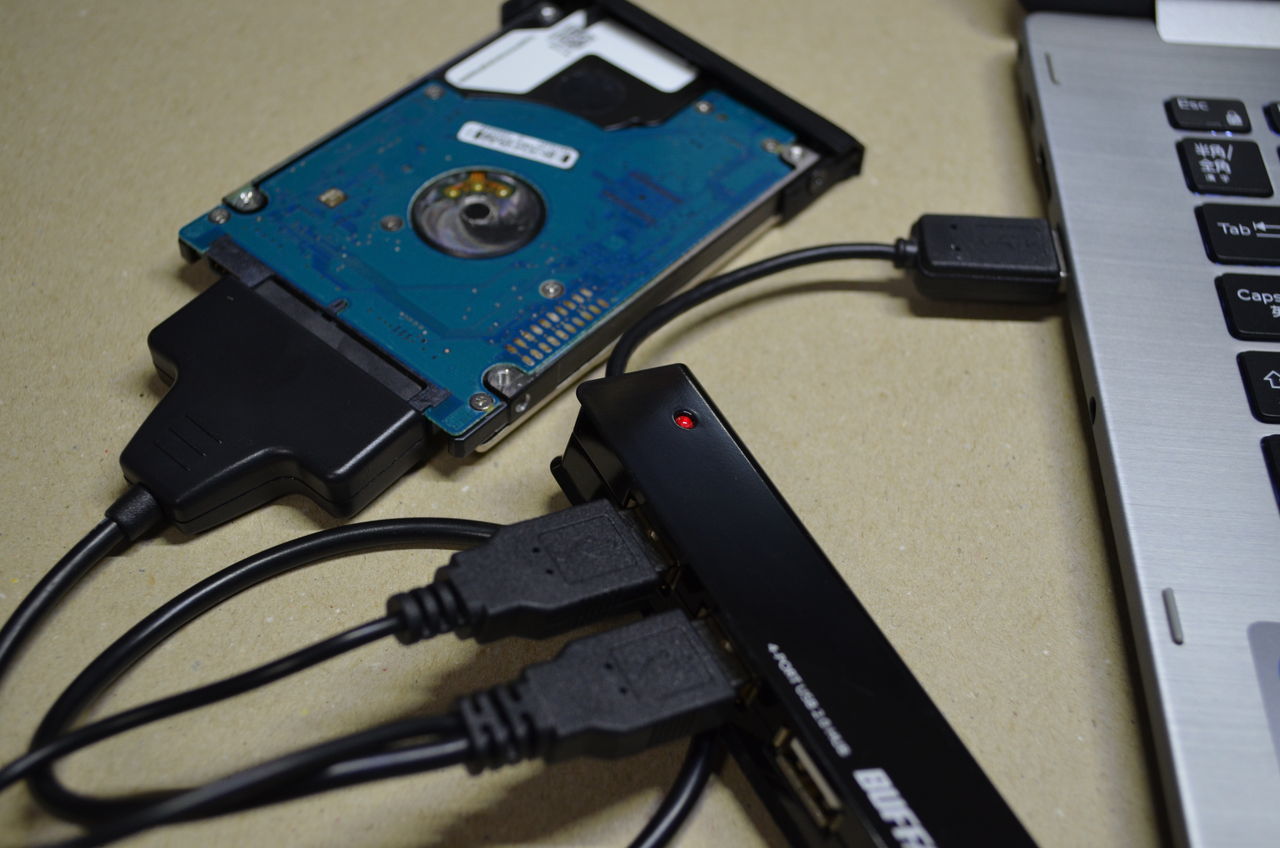 取り出したHDDにSATA端子を差し込み、USB端子をPCに差し込みます。PC側にUSB端子が2つなかったので、USBハブを使い増設!