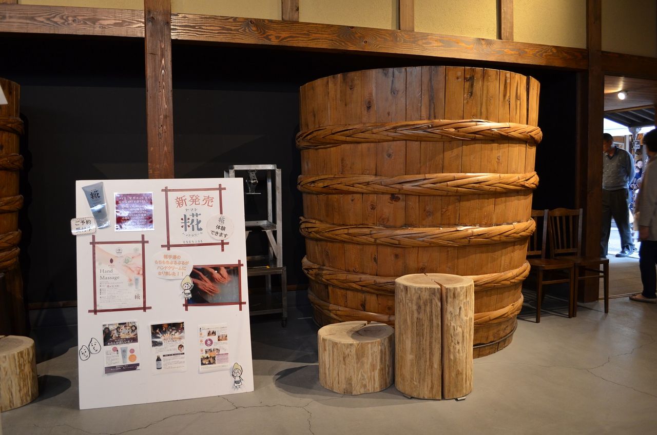 そんなこんなでぶらぶら観て回っていると、人だかりができている一角を発見。近づいてみると糀湯を使った無料のハンドバスがありました。3分間手を浸すとお肌がぷるぷるになるのだそう。