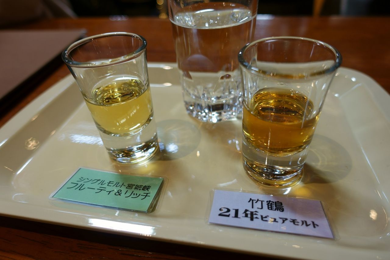 メニュー表を見てみると、すでに生産終了している銘柄や高価な銘柄、宮城峡蒸留所限定の銘柄が1杯500円ほどという破格の値段。以前から飲んでみたかった「竹鶴21年」と宮城峡蒸留所限定の「シングルモルト宮城峡 フルーティ&リッチ」を試飲してみました。