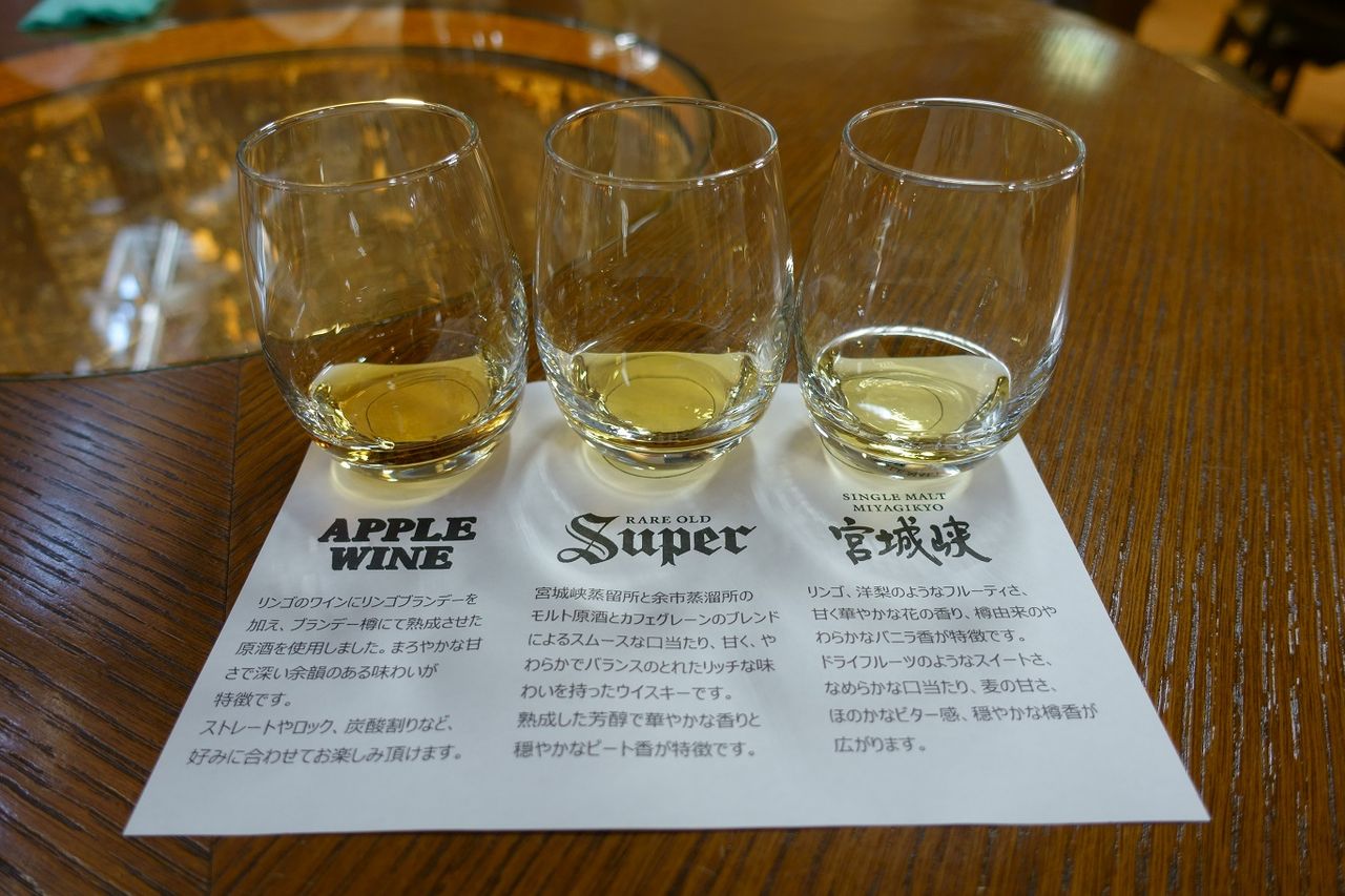 ガイド見学が終わると、お楽しみの無料試飲コーナーへと案内されます。ここでは3種類のお酒を無料で試飲することができます。今回提供されたのは「アップルワイン」「スーパーニッカ」「シングルモルト宮城峡」でした。