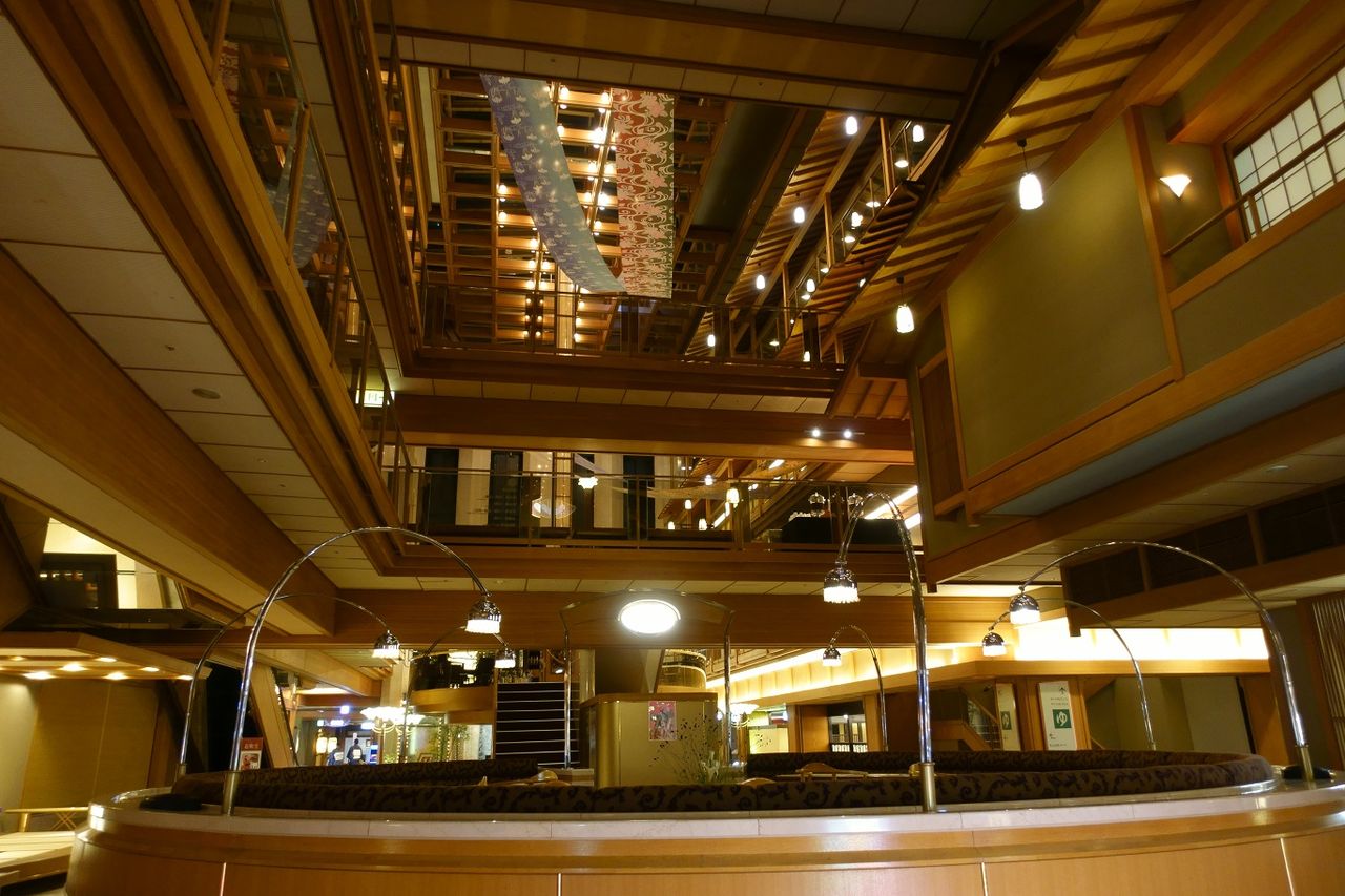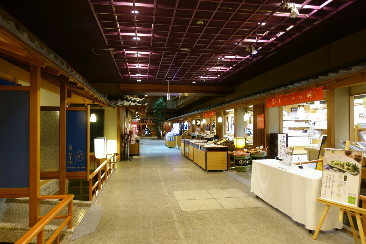館内の豪華絢爛さに圧倒されます。琴の生演奏が流れるラウンジ、宿場町をイメージしたかのような土産物店、吹き抜けに浮かぶBAR。正直、バブル感は否めませんが、ここまで振り切っていると凄いの一言です。