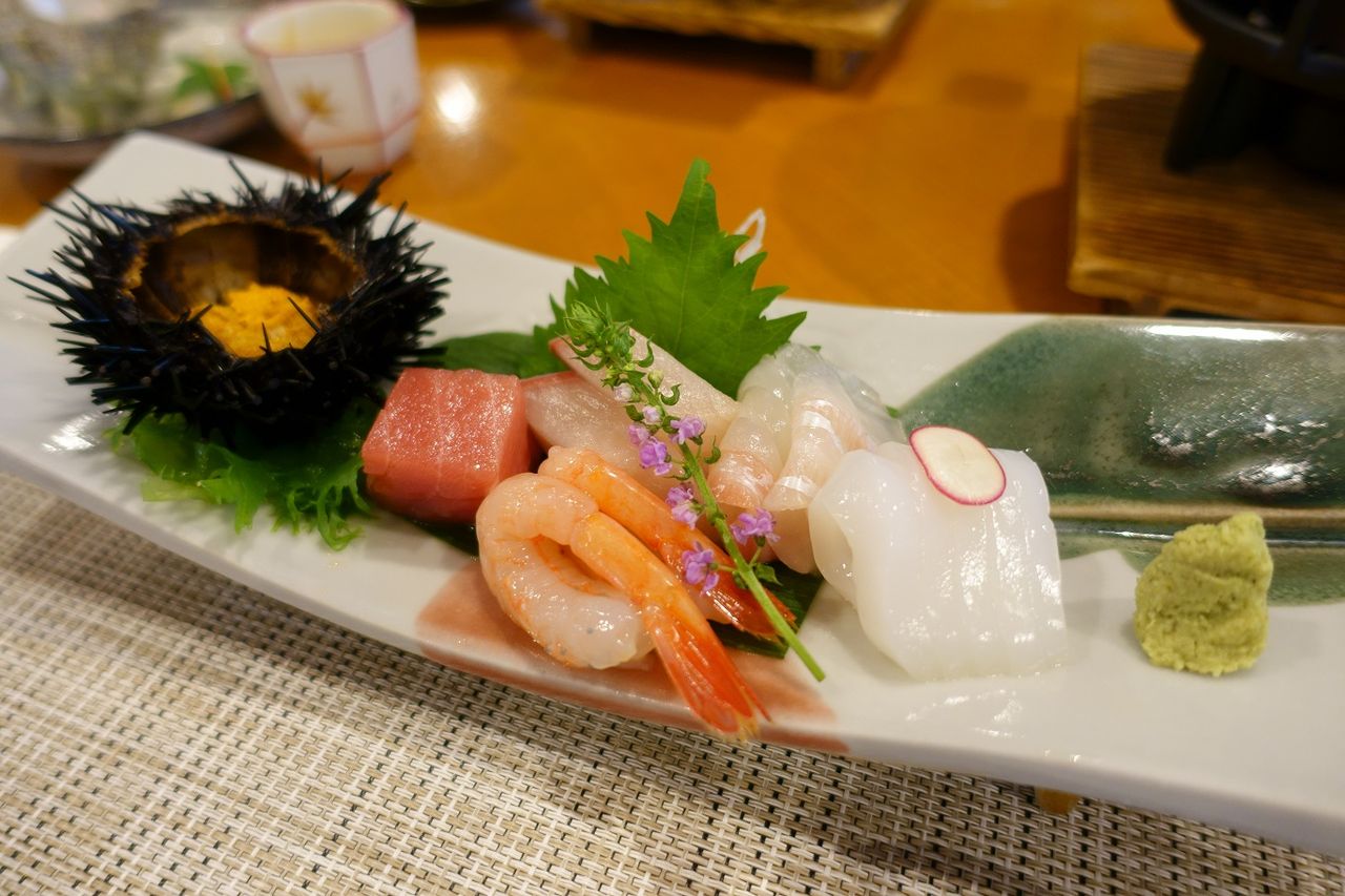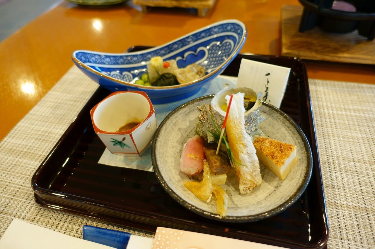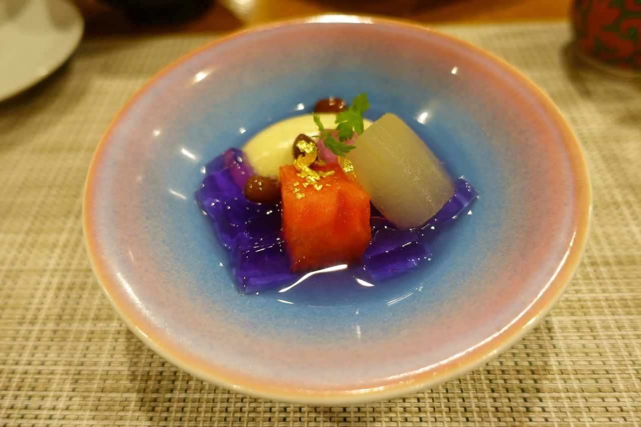 場所は最上階のレストランでした。主に季節の食材が使われており、今は「能登の夏」をイメージした料理とのこと。食前酒を頂き、上品な料理の数々に手をつけていきます。