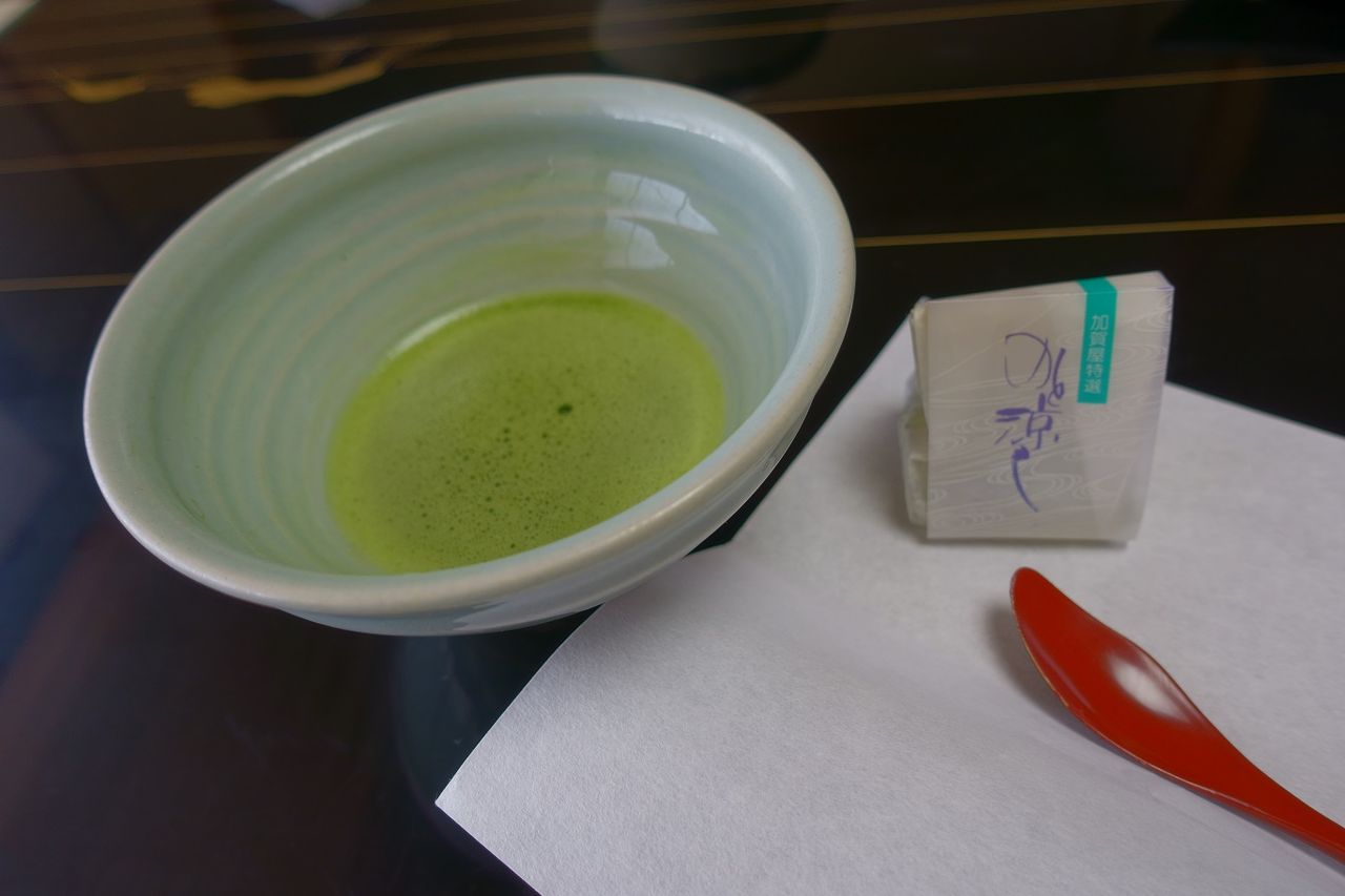 仲居さんが淹れてくれた抹茶とお茶菓子を頂きながら館内説明を聞きます。とにかく大きい旅館なので情報量の多いこと多いこと。夕食と朝食の時間を決めて、浴衣を受け取ります。